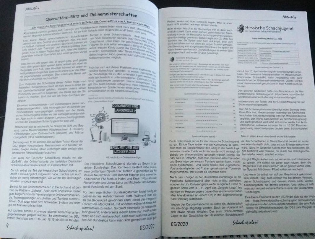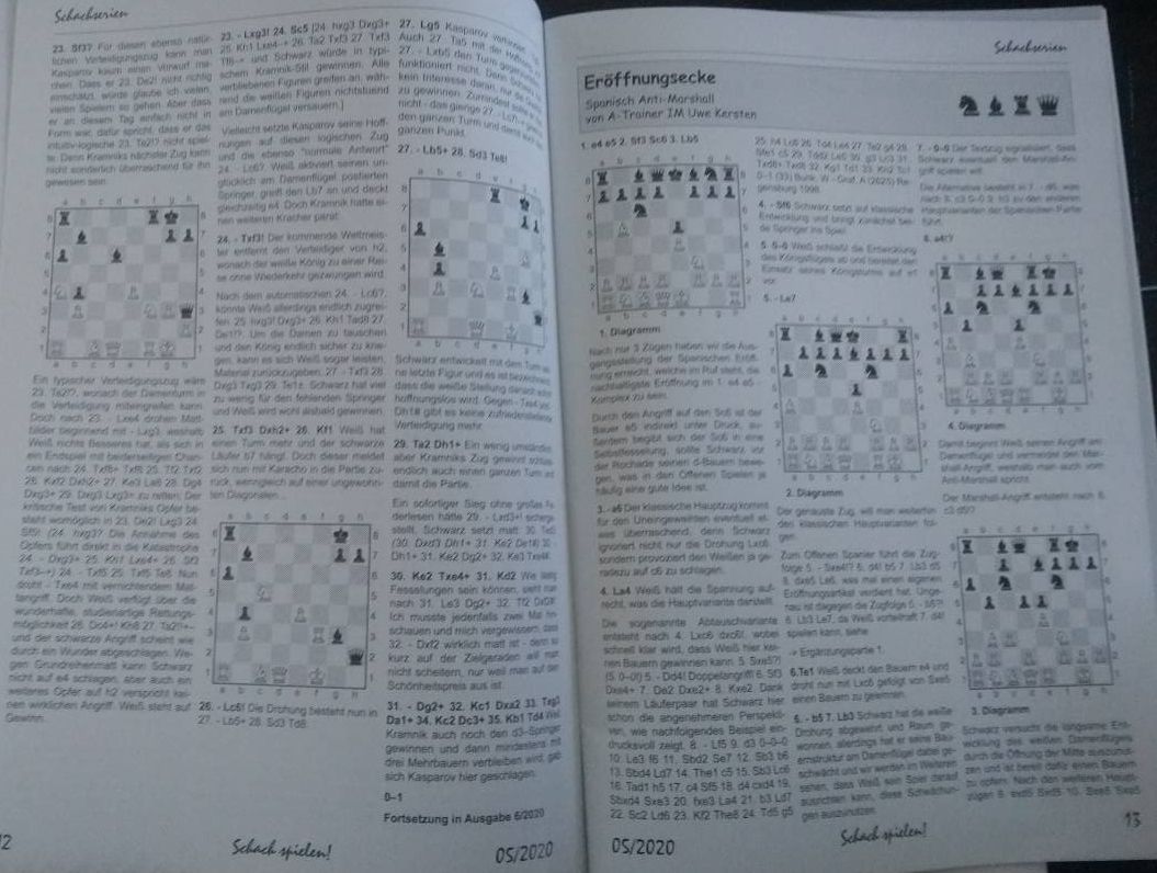 Wir haben von Jonas R. die neueste Ausgabe testen lassen: „Ich finde die Zeitschrift an sich sehr cool, allerdings ist es für mich als Anfänger sehr schwer zbsp den Artikel „wie man Endspiele nicht gewinnt“ zu verstehen, da hier sehr lange Kombinationen an Zügen angegeben sind und ich das einfach nicht so gut visualisieren kann. Selbes gilt auch für die Eröffnungsecke. Die Taktikrätsel fand ich sehr cool und ich hatte viel Spaß, diese zu lösen“